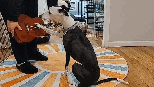 Targeting other objects, like touching a bell with her nose or paw to indicate she needs to go out. (Or strumming the ukulele just for fun, like I taught my dogs to do — see gif.)